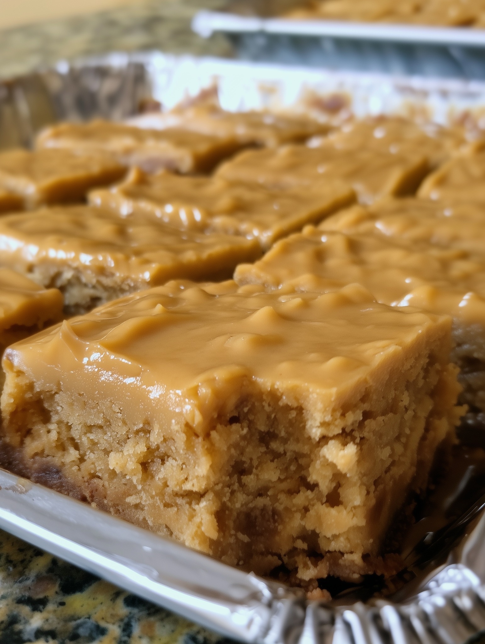 These classic, soft peanut butter bars are topped with a rich, creamy frosting for an irresistible treat that tastes just like the one from the school cafeteria!